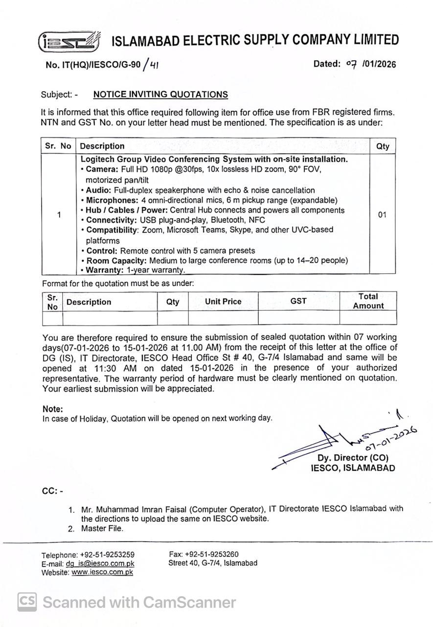 IESCO Tender Notice for Rate Contract of IESCO Canteen