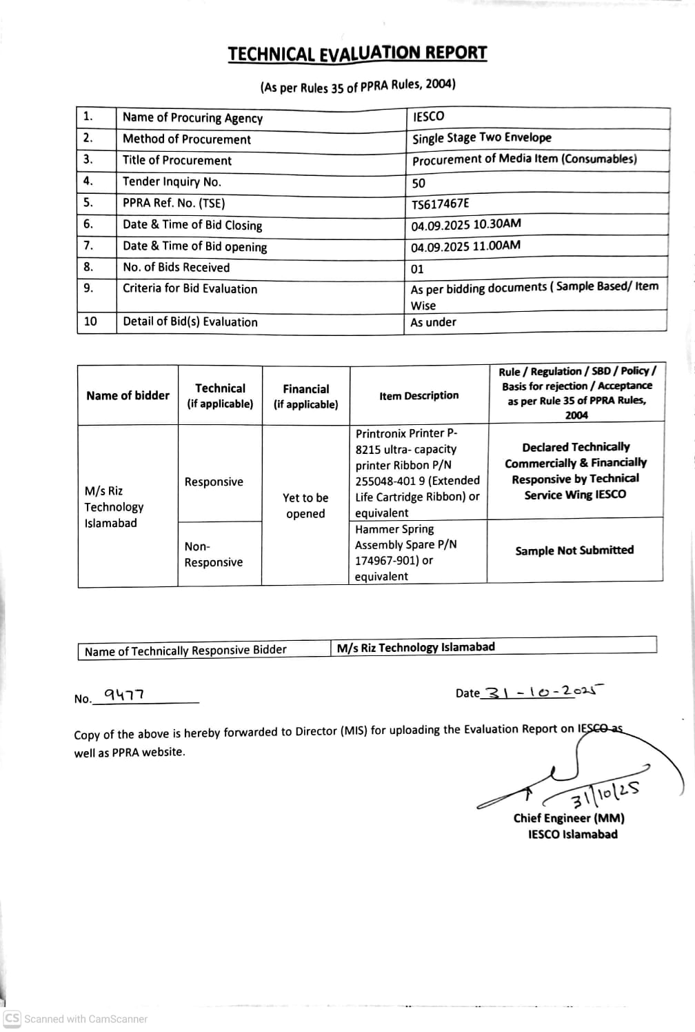 Technical Bid Evaluation Report for IESCO MM Tender Notice No. 50