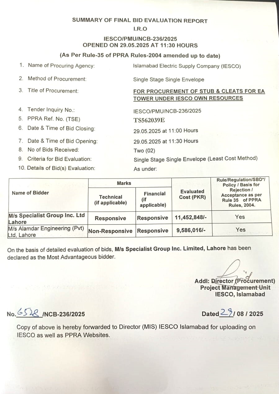 MM Final Evaluation Report for IESCO MM Tender Notice No. 262 04 Sep, 2025 17:00 PM FINAL