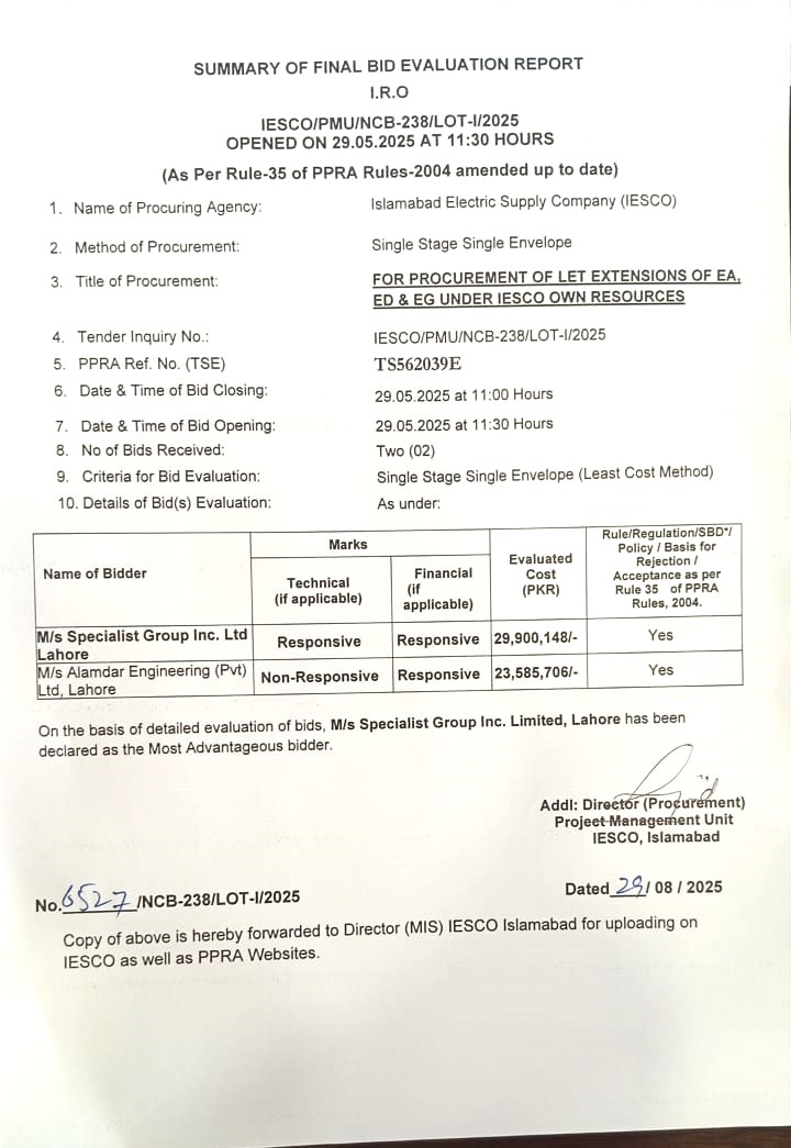 PROCUREMENT Summary of Final Bid Evaluation Report for IESCO PROCUREMENT NCB-238 (Lot-I)/2025 29 Aug, 2025 12:30 PM FINAL