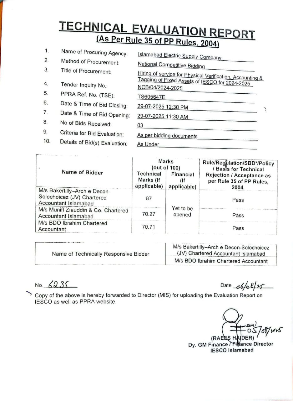 FD Technical Bid Evaluation Report for IESCO Finance Directorate Tender Notice No. NCB-04/2024-2025 08 Aug, 2025 12:30 PM TECH
