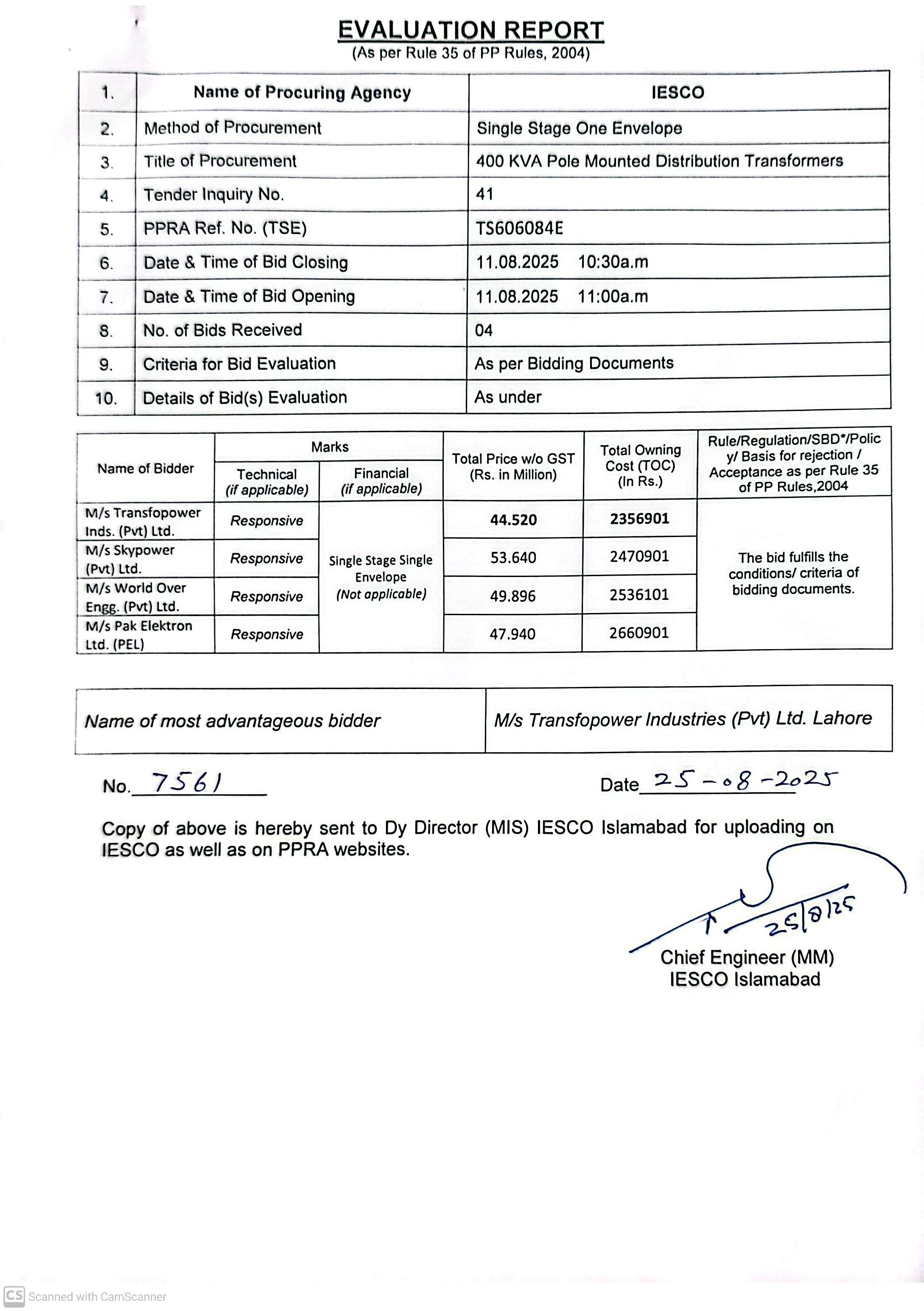 MM Evaluation Report for IESCO MM Tender Notice No. 04 25 Aug, 2025 17:00 PM