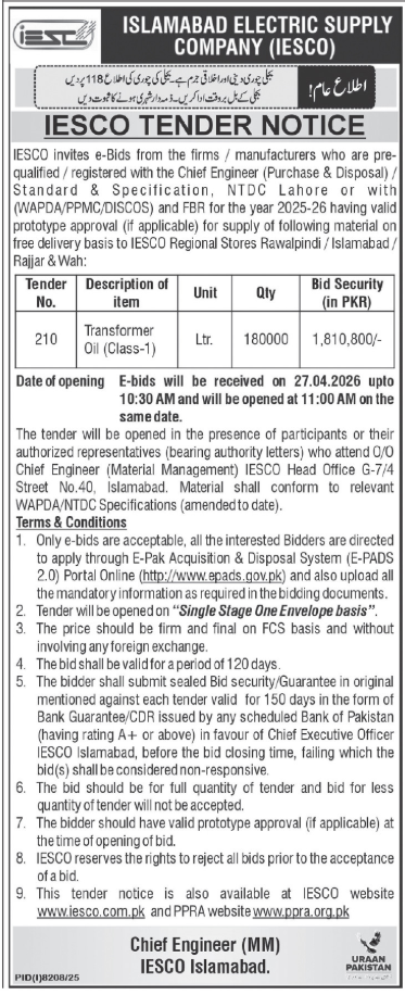 MM IESCO MM Tender Notice No. 210 27 Apr, 2026 11:00 AM N/A